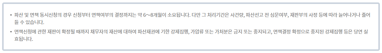 | 면책 기간 | 변제 완료 후 즉시 | 법원 결정 후 즉시 |