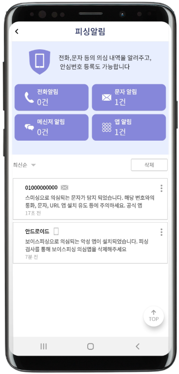 ✔ 스마트폰 내 악성 앱·스미싱 메시지·악성 링크를 실시간 탐지 및 차단
