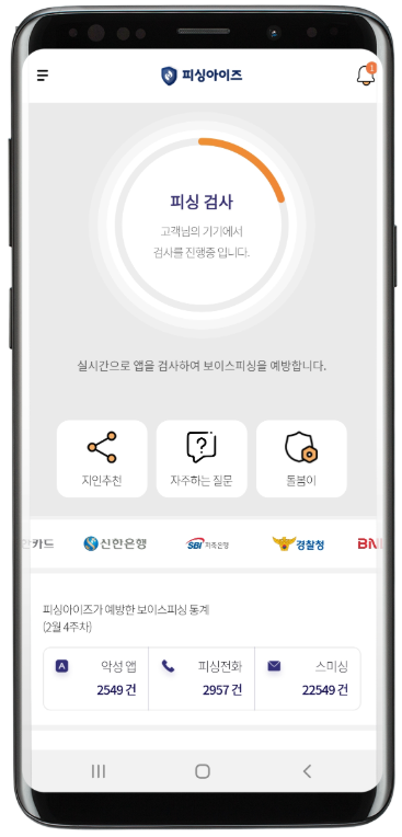 피싱아이즈는 제휴금융사와 다양한 유형의 피싱에 대해 공동으로 분석하고 대응함으로써, 이용자들에게 최적의 예방의 솔루션을 제공합니다. 피싱아이즈는 나의 가족 및 지인의 휴대폰에서